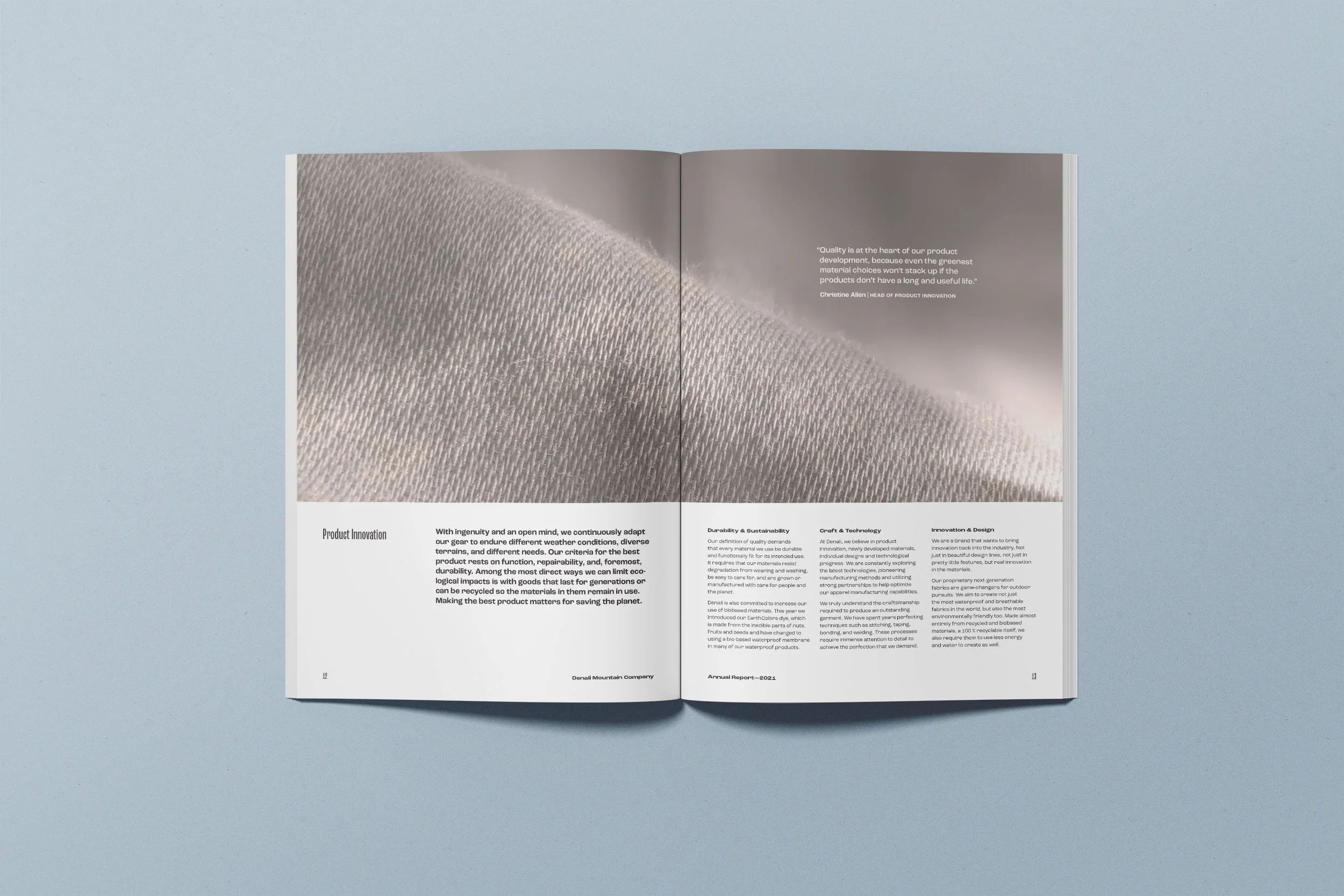 Denali Mountain Company is a (hypothetical) outdoor apparel company based in Alaska, dedicated to sustainable product development and doing business ethically. The brand aims to inspire people to get out and explore, to feel the thrill of travel and adventure in the wilderness.